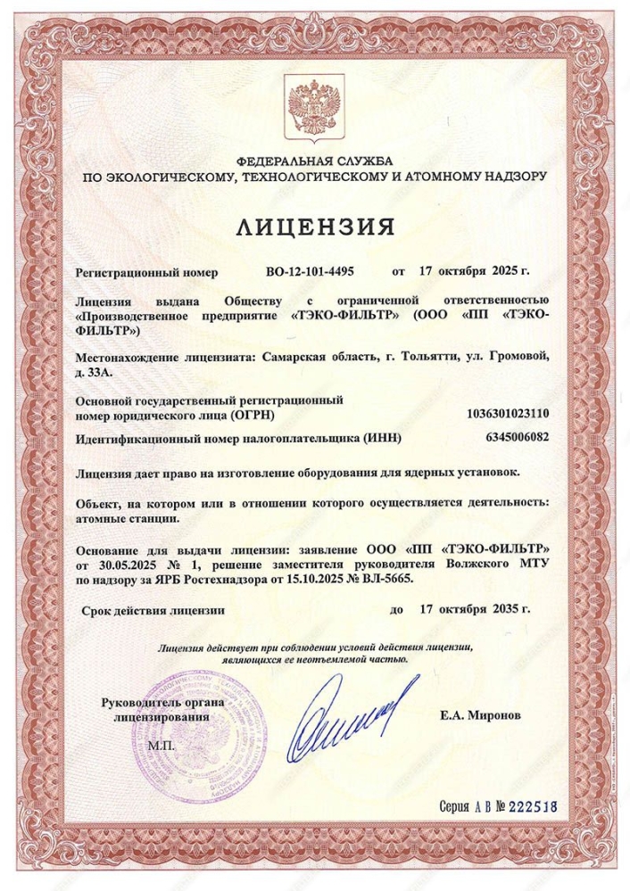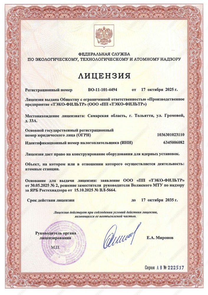 The TEKO-FILTER manufacturing company successfully re-certified and renewed two licenses from the Federal Service for Environmental, Technological, and Nuclear Supervision (Rostekhnadzor) for the design and manufacture of equipment for nuclear power plants. The new licenses are valid for 10 years.